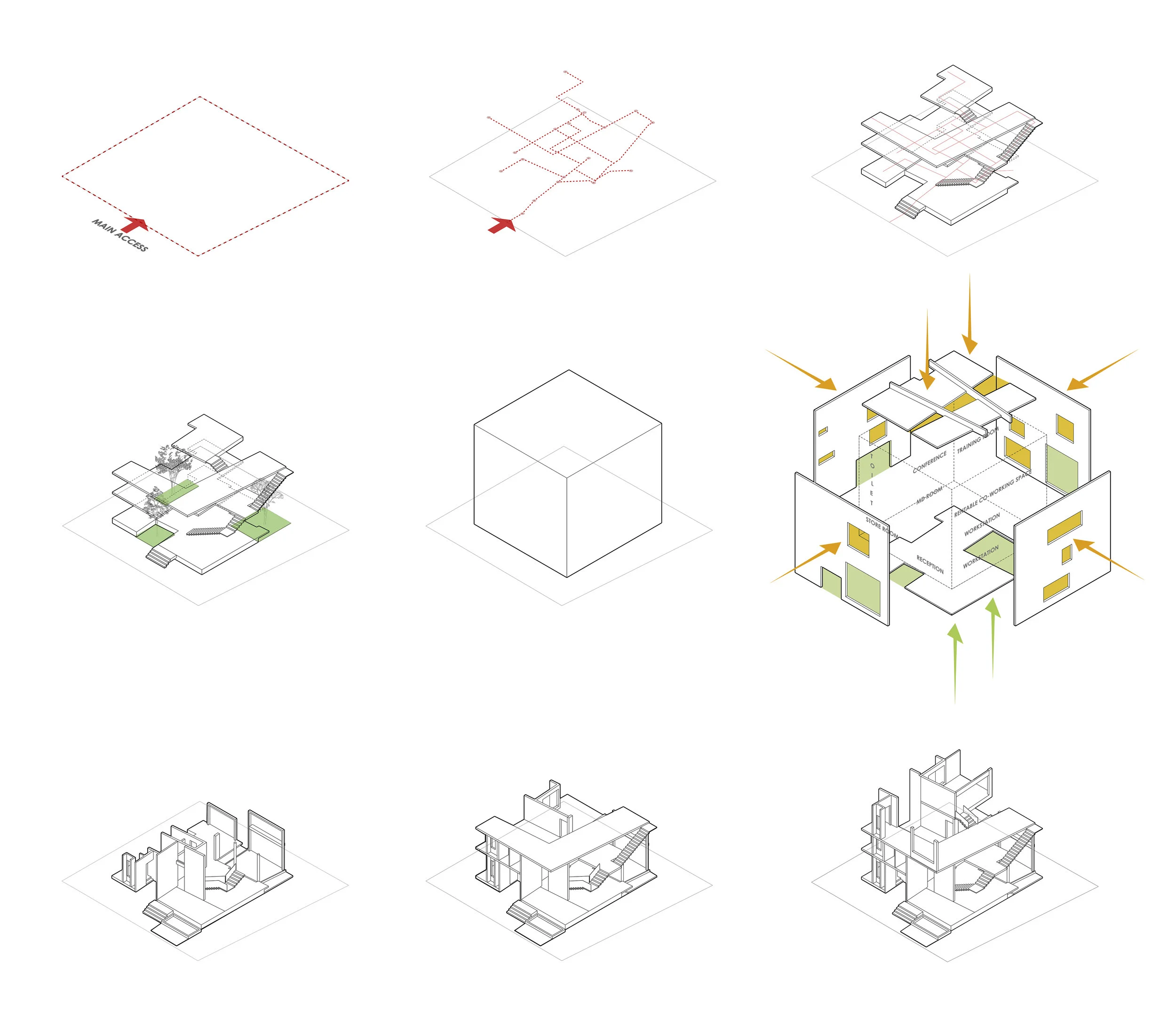 A complex system of fluid spaces, meandering circulation and green pockets are composed in singular volumetric organization inside the concrete cube. Materials such as concrete, metal frame , wood and light furniture with landscape draw the idea of intimate work spaces and voluminous public spaces within an office.